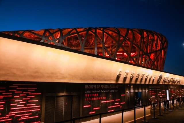 人报融媒讯 2026年4月27日,北京鸟巢。在“可能世界档案:2026国际科技艺术展”中,一部诞生于澳门的演出作品将以一种特殊的方式与中国内地观众相遇——《澳门2049》的精华片段,通过一块可以展现3D效果的屏幕,在鸟巢的公共空间中形成了独特的视觉纵深。