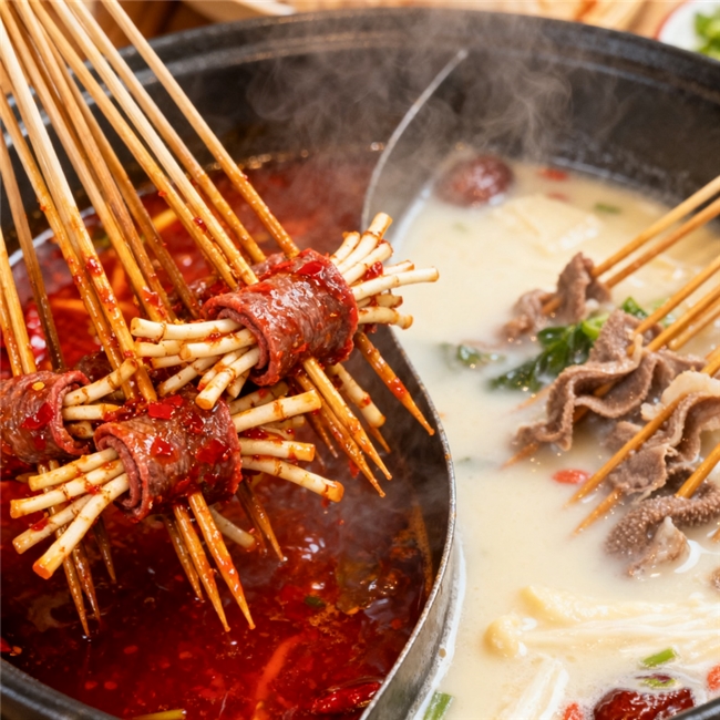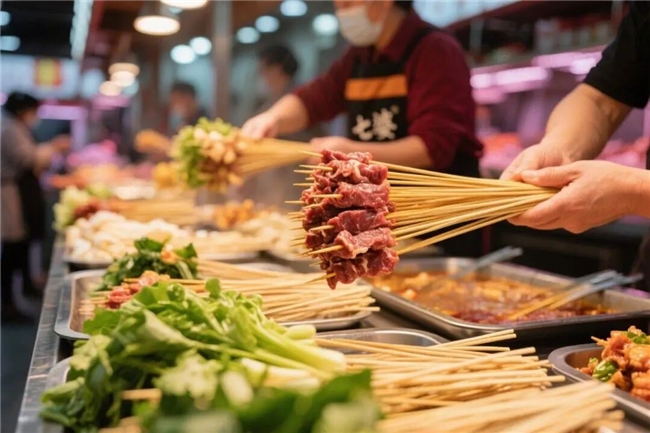 七婆串串香对食材的把关极为严格。每日清晨,采购团队便会奔赴市场,挑选最新鲜的食材。鲜嫩牛肉现切现串,裹满秘制酱料;毛肚处理得干净爽脆;水灵灵的蔬菜带着自然清甜。